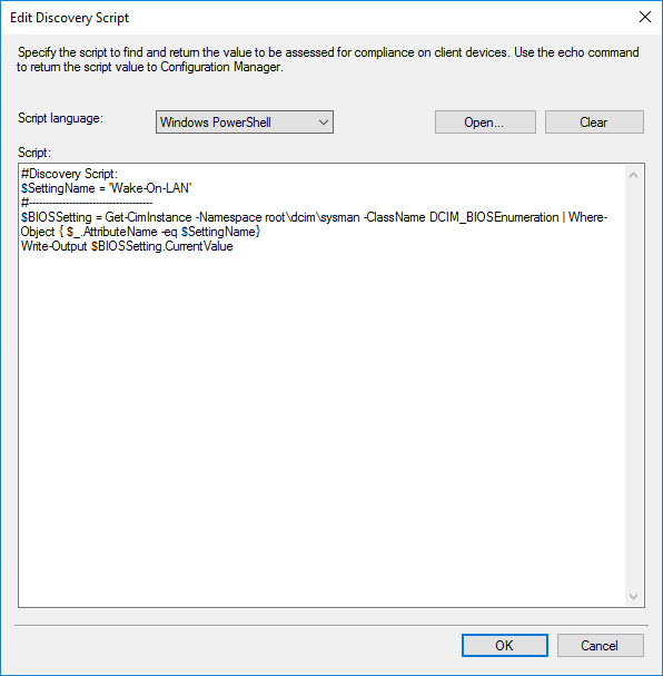 I also like to keep the Discovery Script modular so that it is easy to re-use for multiple BIOS settings. By keeping the Setting name at the top of the script, that is the only thing that needs to be changed for creating Discovery Scripts for other BIOS settings. For the Dell Desktop WoL the discovery script would be the following: