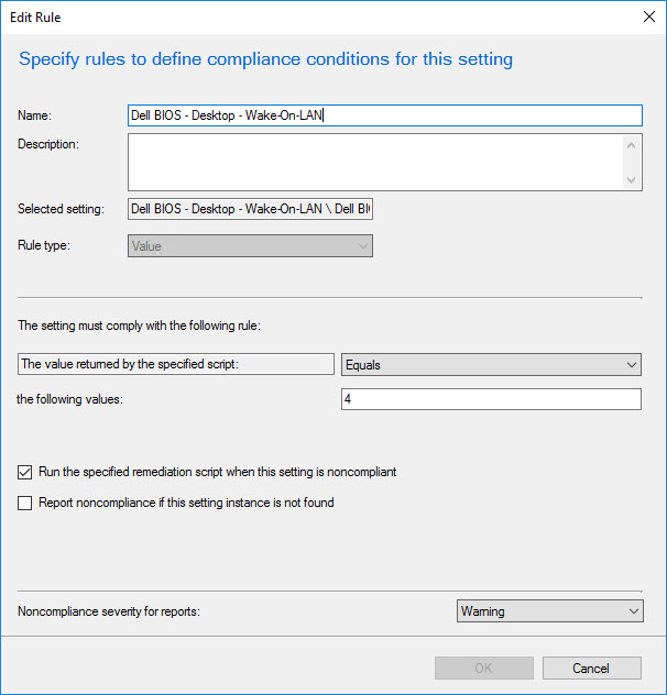 The Compliance Rule will be a string value that should be compared to the desired setting. In this case, I want this setting to be equal to “4” and I want to run the remediation script when the setting is non-compliant. NOTE: In order for the “Run the specified remediation script when this setting is noncompliant” to be visible, there needs to be a remediation script defined which is below.