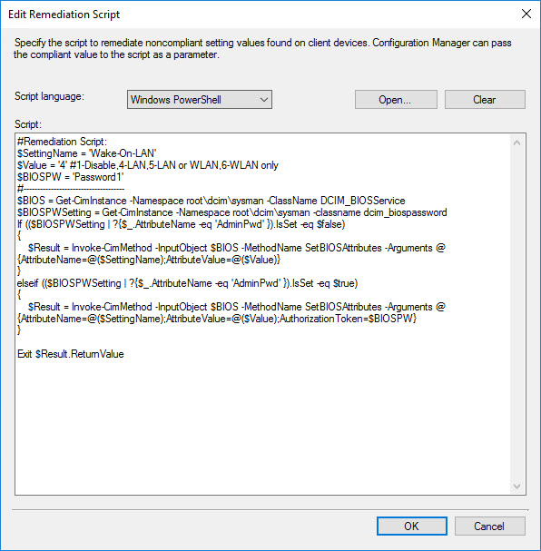 Like the modular Discovery Script, I also like to keep the Remediation Script modular so that it is easy to re-use for multiple BIOS settings. By keeping the Setting name, setting value and BIOS password at the top of the script, that is the only thing that needs to be changed for creating Remediation Scripts for other BIOS settings. For the Dell Desktop WoL, the remediation script would be the following: