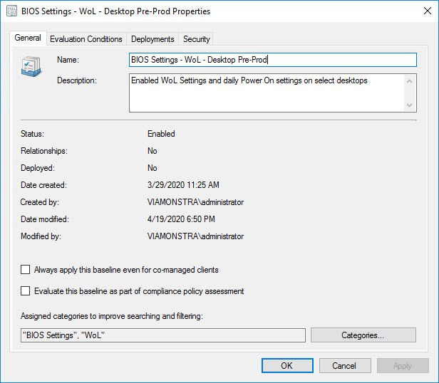 Just like the CI, I also like to use categories for easy searching/filtering and use “BIOS Settings” and “WoL” for this Baseline. The Baseline General tab looks like the following: