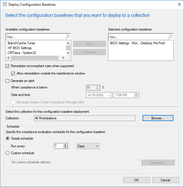 This Configuration Baseline can now be deployed to a target collection like All Desktops and only the settings will only be applied to the applicable systems based on the detection methods.. Be sure to enable “Remediate noncompliant rules when supported” (and “Allow remediation outside of maintenance window” if desired).