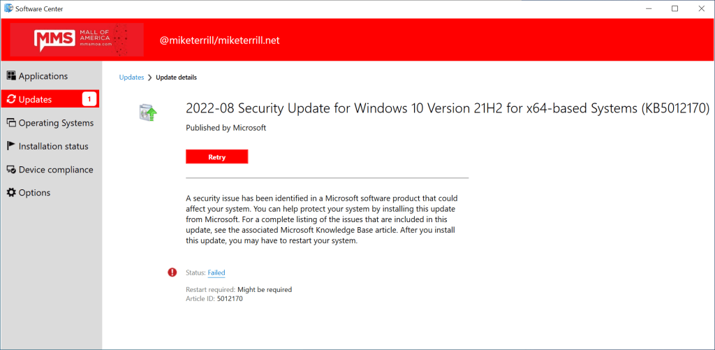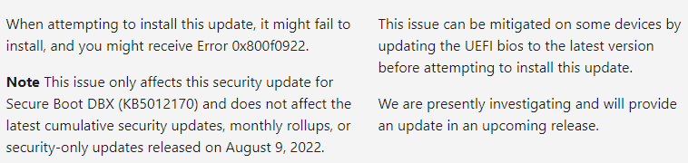 The intent of this patch is actually good as it addresses three security vulnerabilities (CVEs) by updating the Secure Boot Forbidden Data (DBX) and blocking these compromised boot loaders. In other words, do not skip it, but rather take a crawl-walk-run approach when deploying it and be sure to test it thoroughly. Microsoft has now acknowledged another issue with this patch where it fails to install with error 0x800F0922. This is now listed on the support article under know issues: