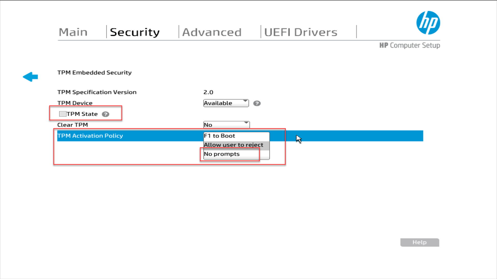 Checking the TPM State configuration of this machine, I can see that the TPM State is set to Disable: